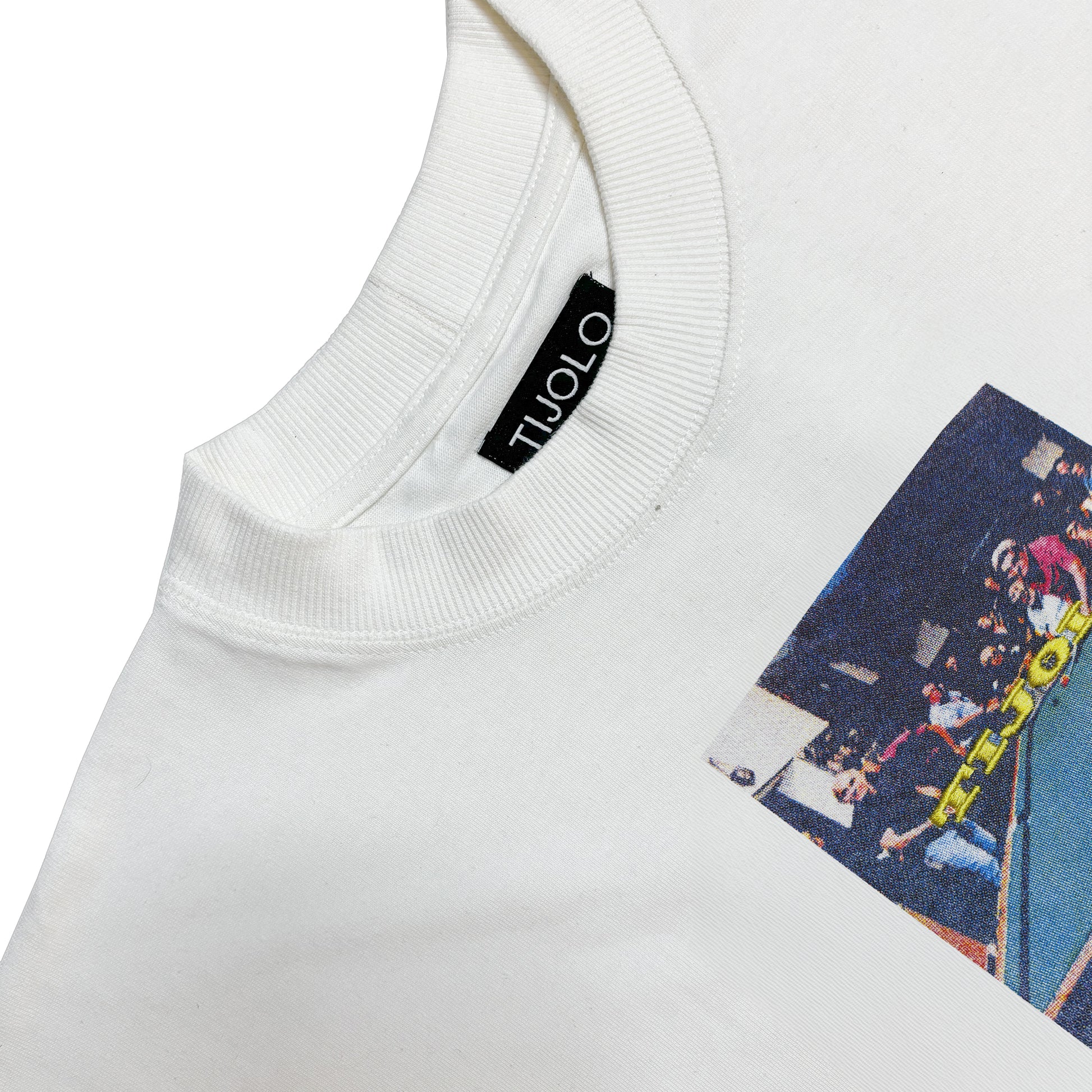 100% cotton T-shirt with ribbed crewneck, full-color screen print, and embroidered Tijolo logo.