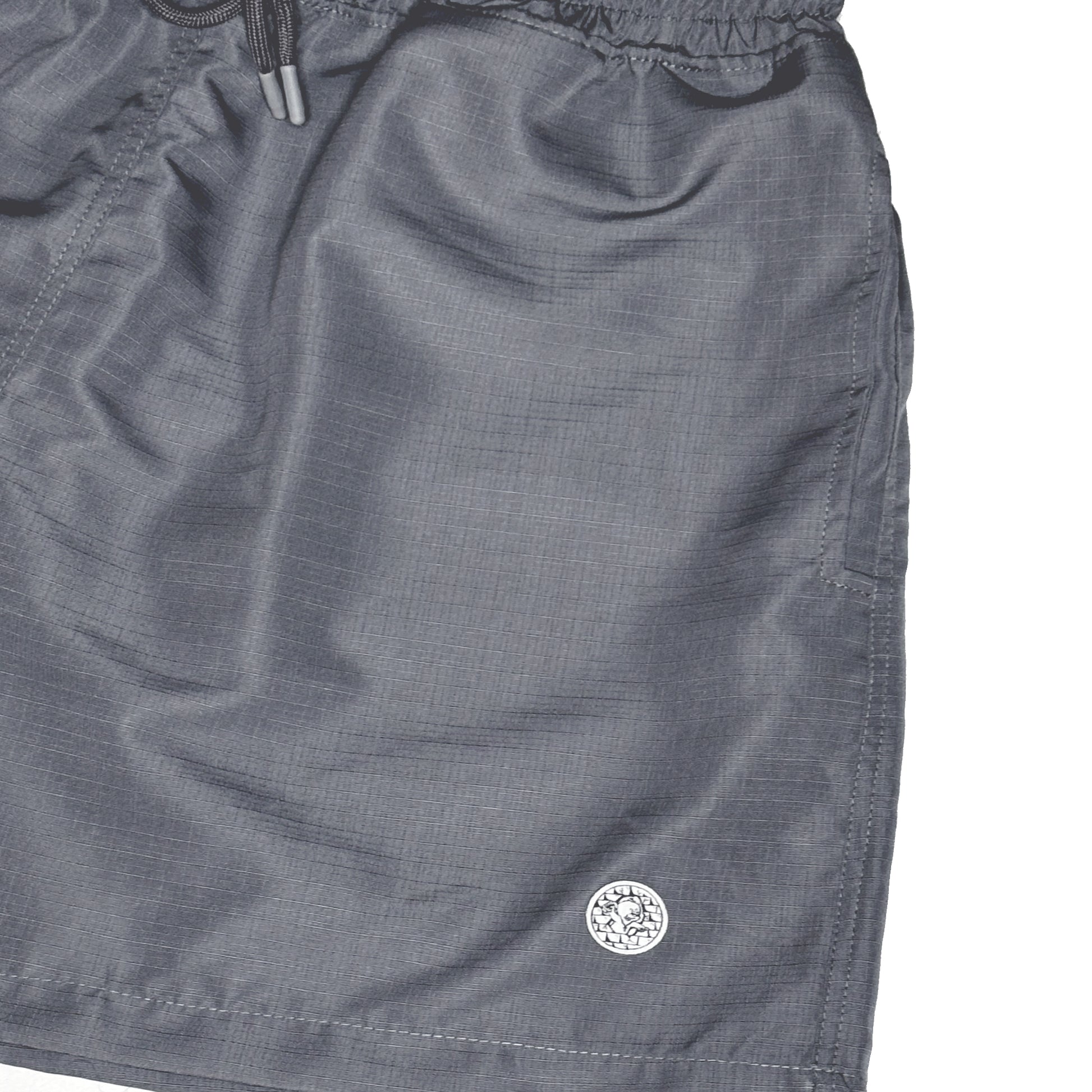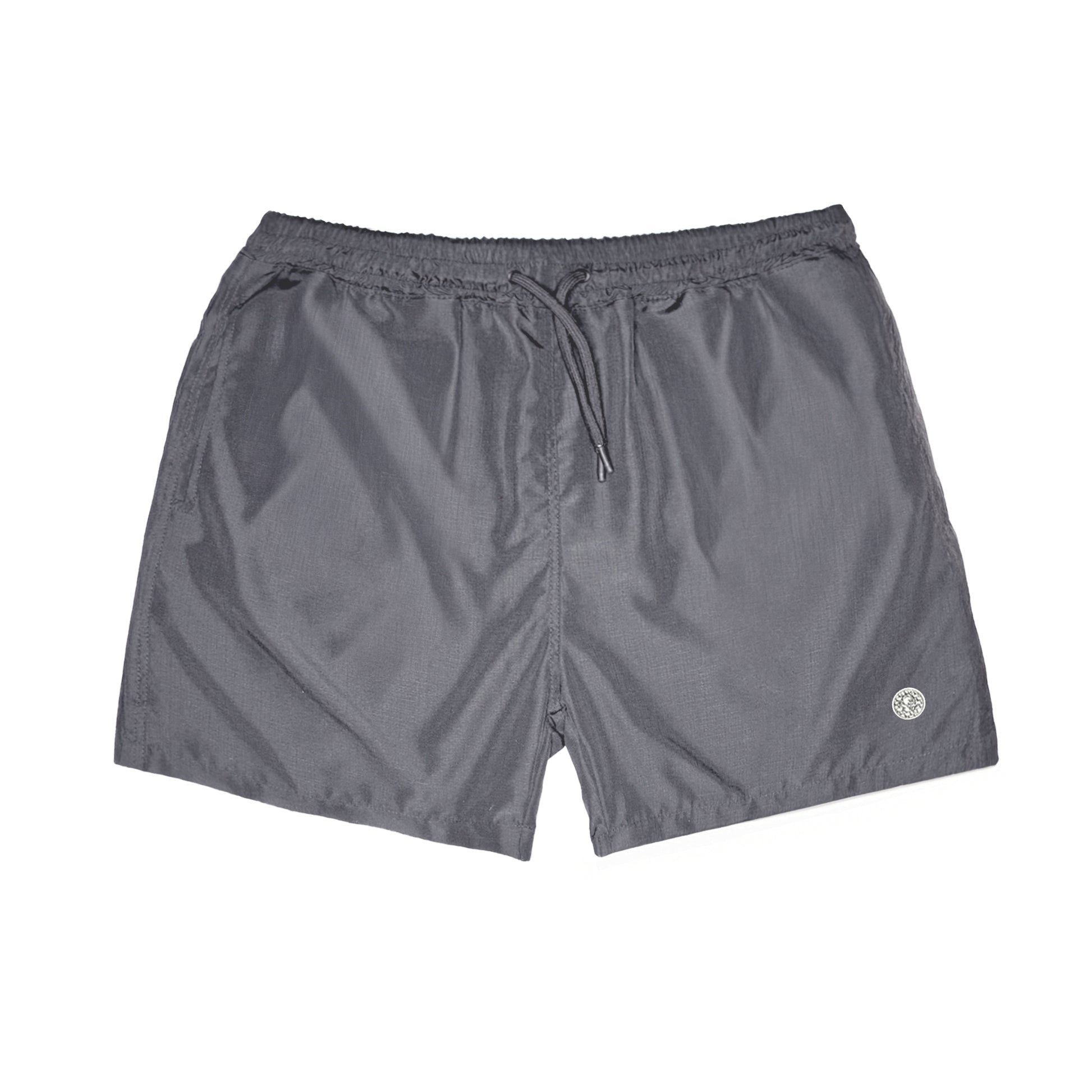 Oversized fit swim shorts with heat-sealed patch on the left side.